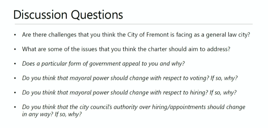 (FREMONT, CA.) – In Fremont’s Charter Advisory Committee’s third meeting on April 6, city staff guides the committee through a set of questions regarding