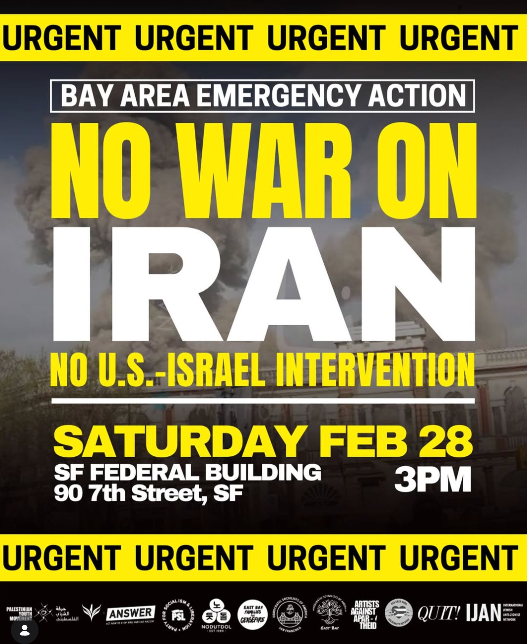The post urged San Francisco residents to join the protest by stating, “The only way to curb US imperialism worldwide is through a people’s arms embargo. From the belly of the beast, we say: Hands off Iran, hands off our region! Arms embargo now!”