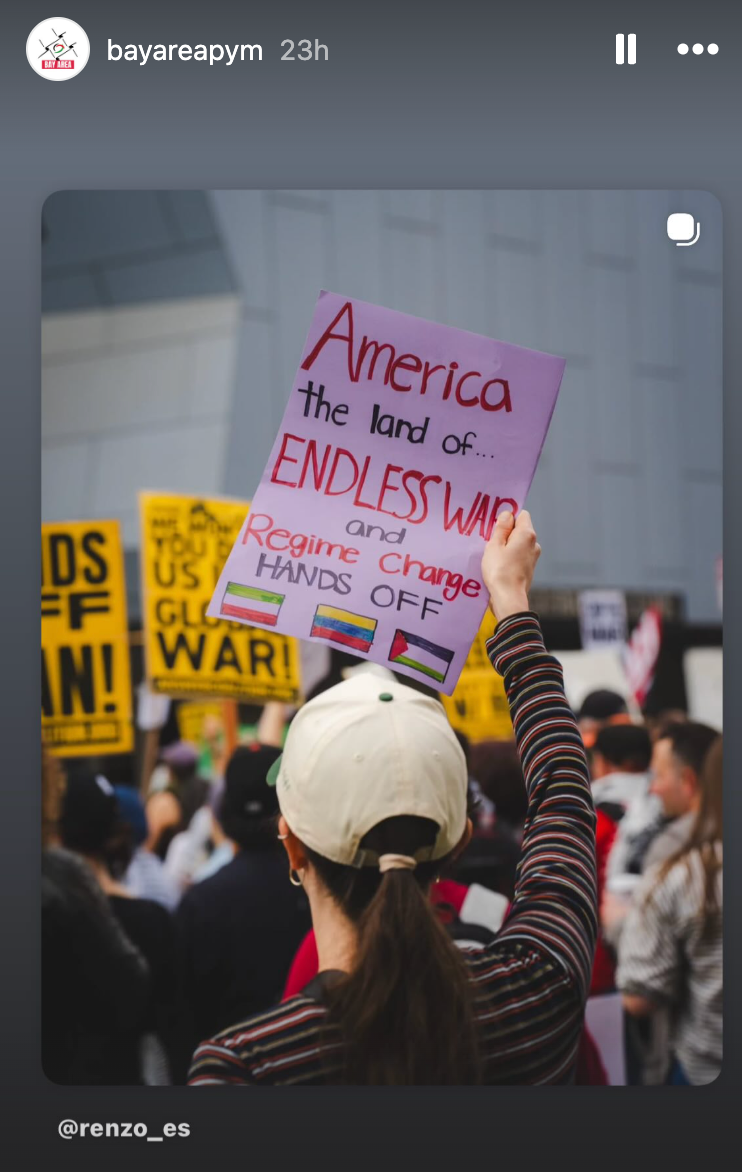 In the early hours of Saturday, Feb. 28, following the Israeli and American military strikes on Iran, the Bay Area Chapter of the Palestinian Youth Movement wrote on their Instagram page, “Israel and the United States have struck Iran. In the last hour, large clouds of smoke could be seen billowing from areas in central Tehran.”