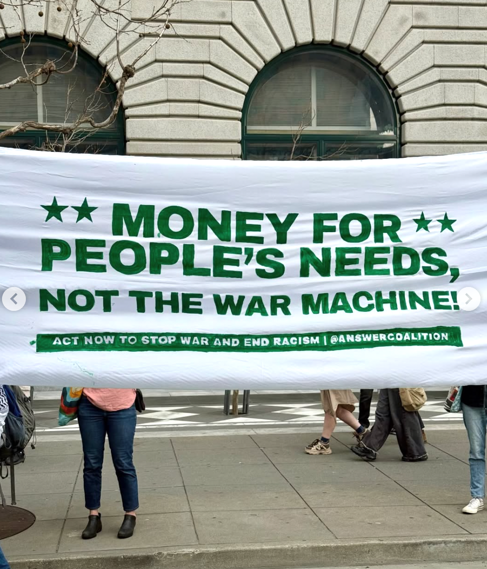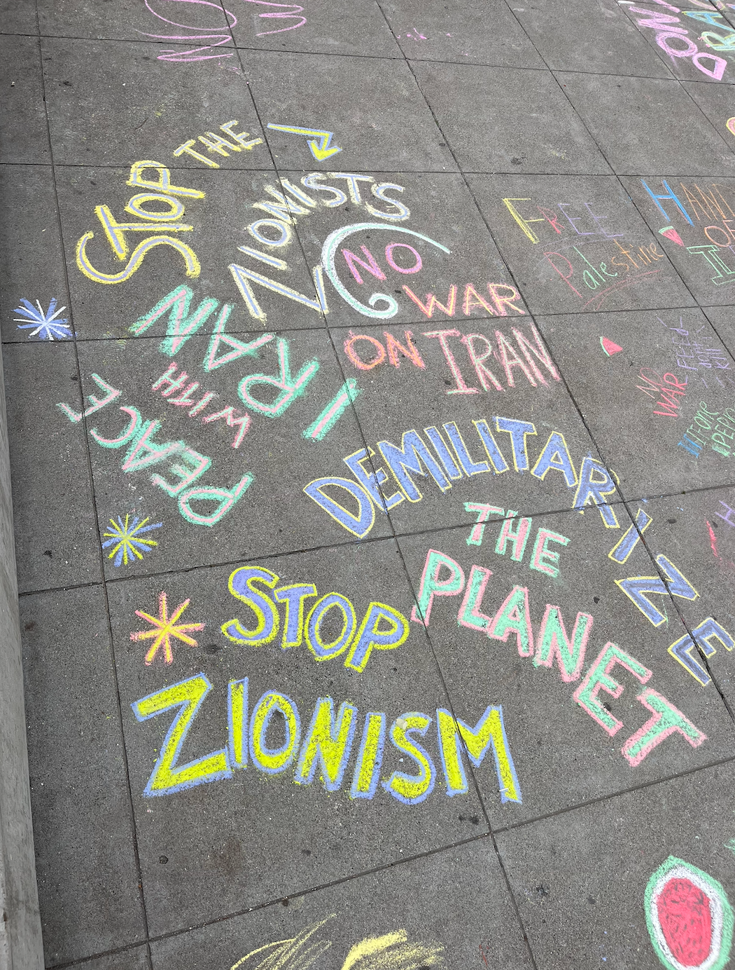 Other forms of protest included colorful chalk displays, the waving of Palestinian flags, and large banners, including one stating, “Money For People’s Needs, Not the War Machine!”