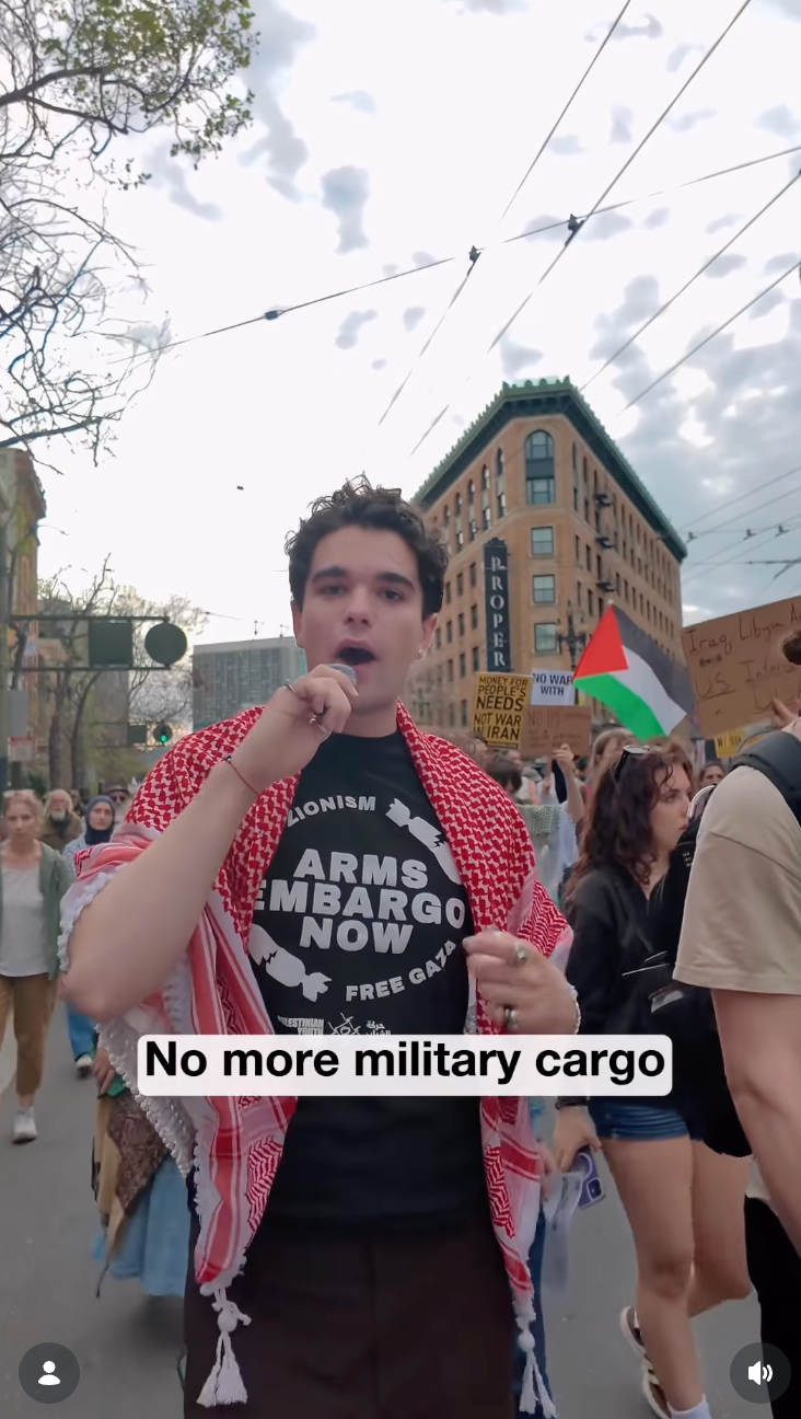 Another Bay Area activist said, “We here in the Bay Area demand an arms embargo now, no more military cargo out of our ports. We demand an end to Zionism, and an end to the war in Iran by the United States and Israel,” as he marched along with the crowd.