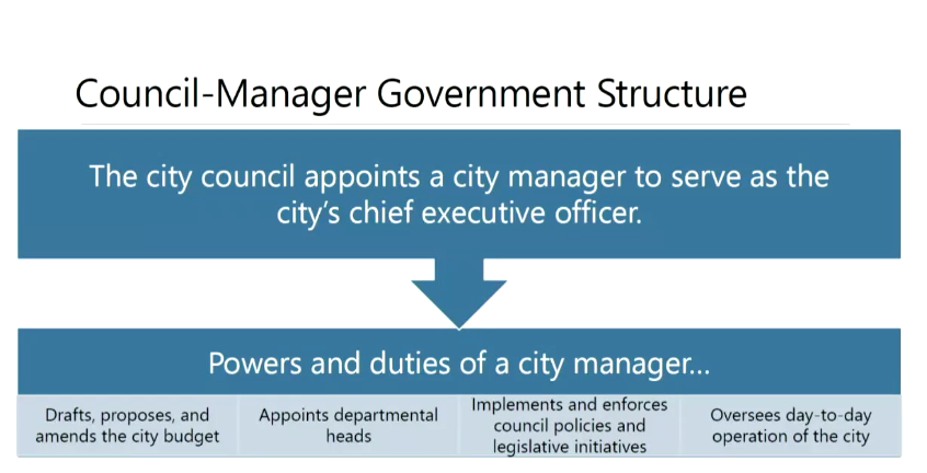“So as Rafael indicated, the city council appoints the city manager to serve as the city’s CEO. [...] If we’re using that analogy, the city council functions as the board of directors.”