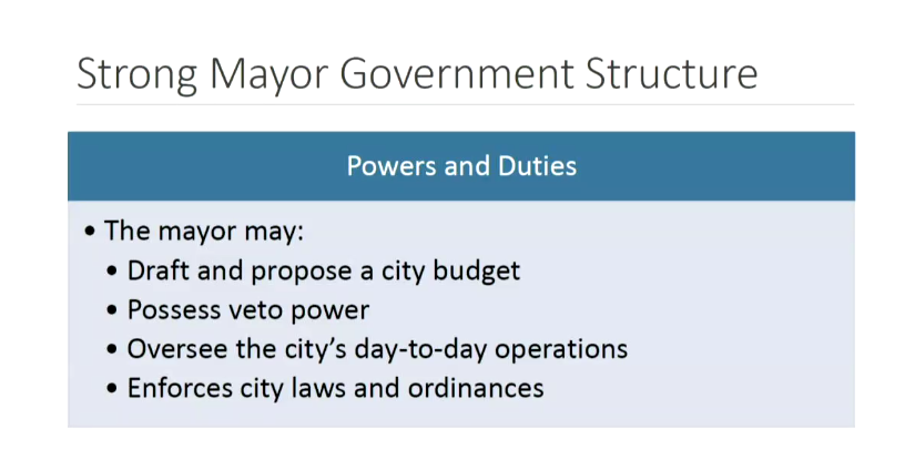 Revealed later during the committee discussion period of the meeting, the information in the presentation is meant to show the committee the different options they have if they wish to change their form of government.