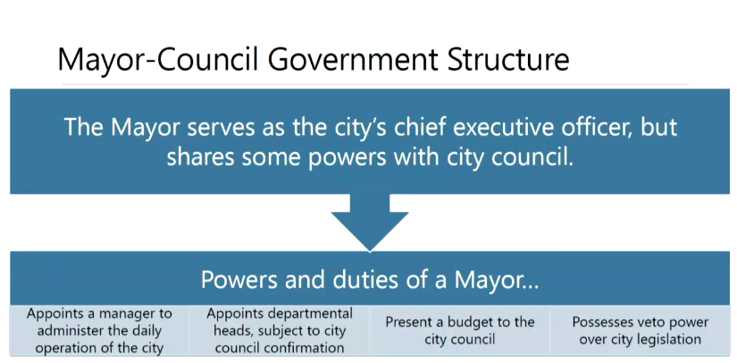 In a Mayor-Council government structure, the powers given to the city manager and the mayor above are split more evenly between the mayor and the city council.