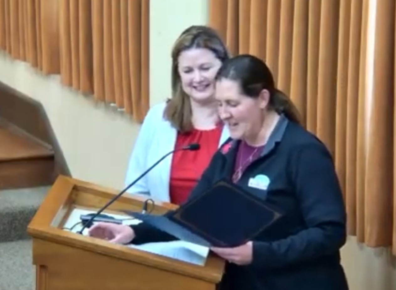 Mayor Kelley Davis (right) reads the proclamation declaring March as Nutritional and Trisomy Awareness Month and March 9th as Trisomy 9 Day in Auburn. Vice Mayor Rachel Radell-Harris at her side. Photo Credit: Auburn City Council / Youtube / Image by Robert MacMahon