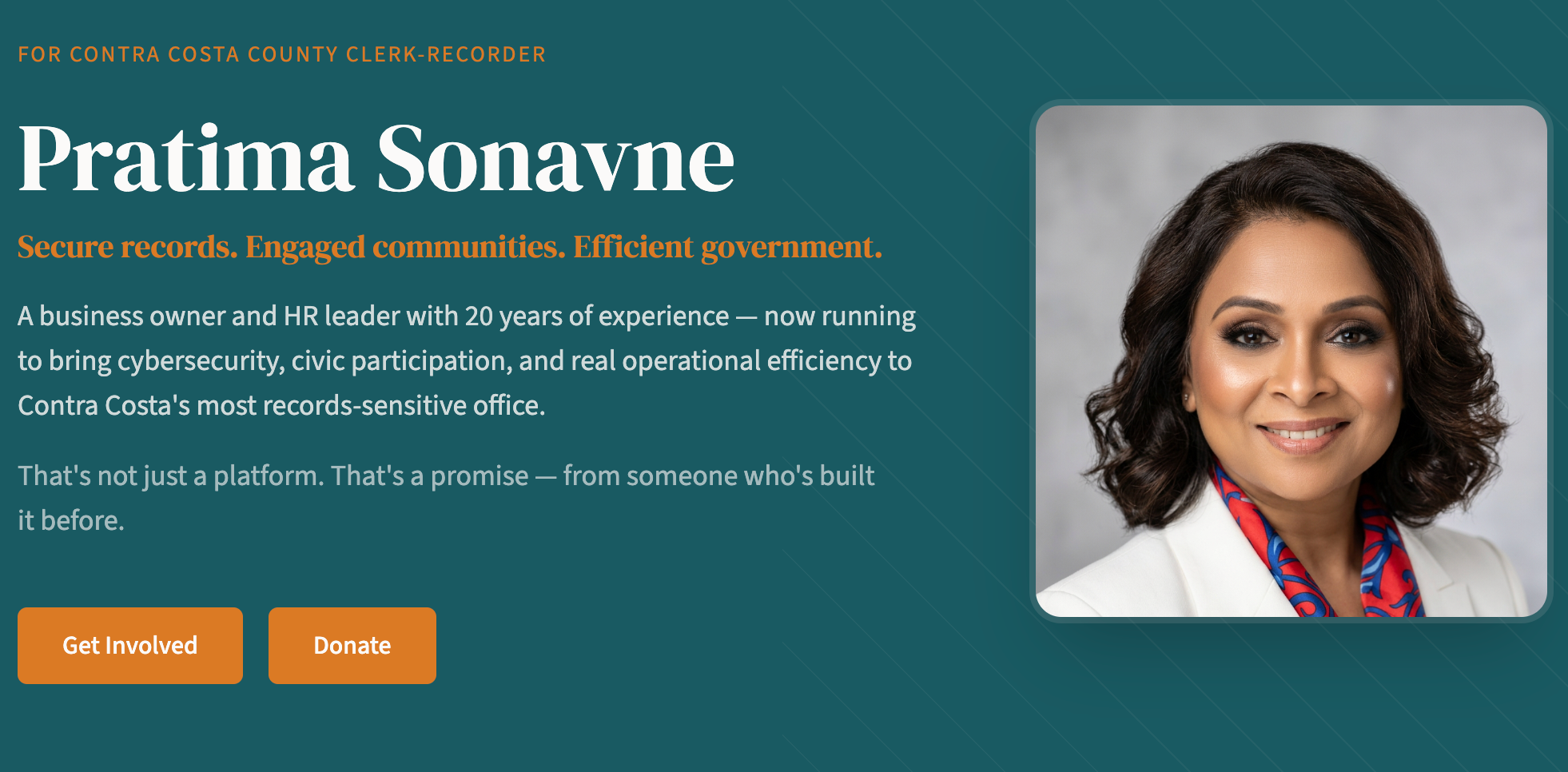 (CONTRA COSTA COUNTY, CA.) – Pratima Sonavne is running for Contra Costa County Clerk Recorder with promises to modernize the user experience and reinstate radical transparency.
