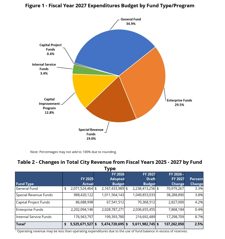 Figure 1 and Table 2 in the city’s budget report show how spending is divided and how revenue has changed from fiscal years 2025 to 2027. Photo Credit: City of San Diego