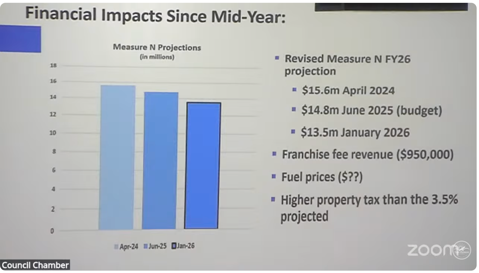 Next on the agenda was a presentation to initiate the FY 2026-27 budget development process, providing the council with an overview of the city’s fiscal model, budget guidelines, and timeline. Finance Director Jennifer Wakeman led the presentation and revealed a revised Measure N sales tax revenue and a long-term structural deficit.