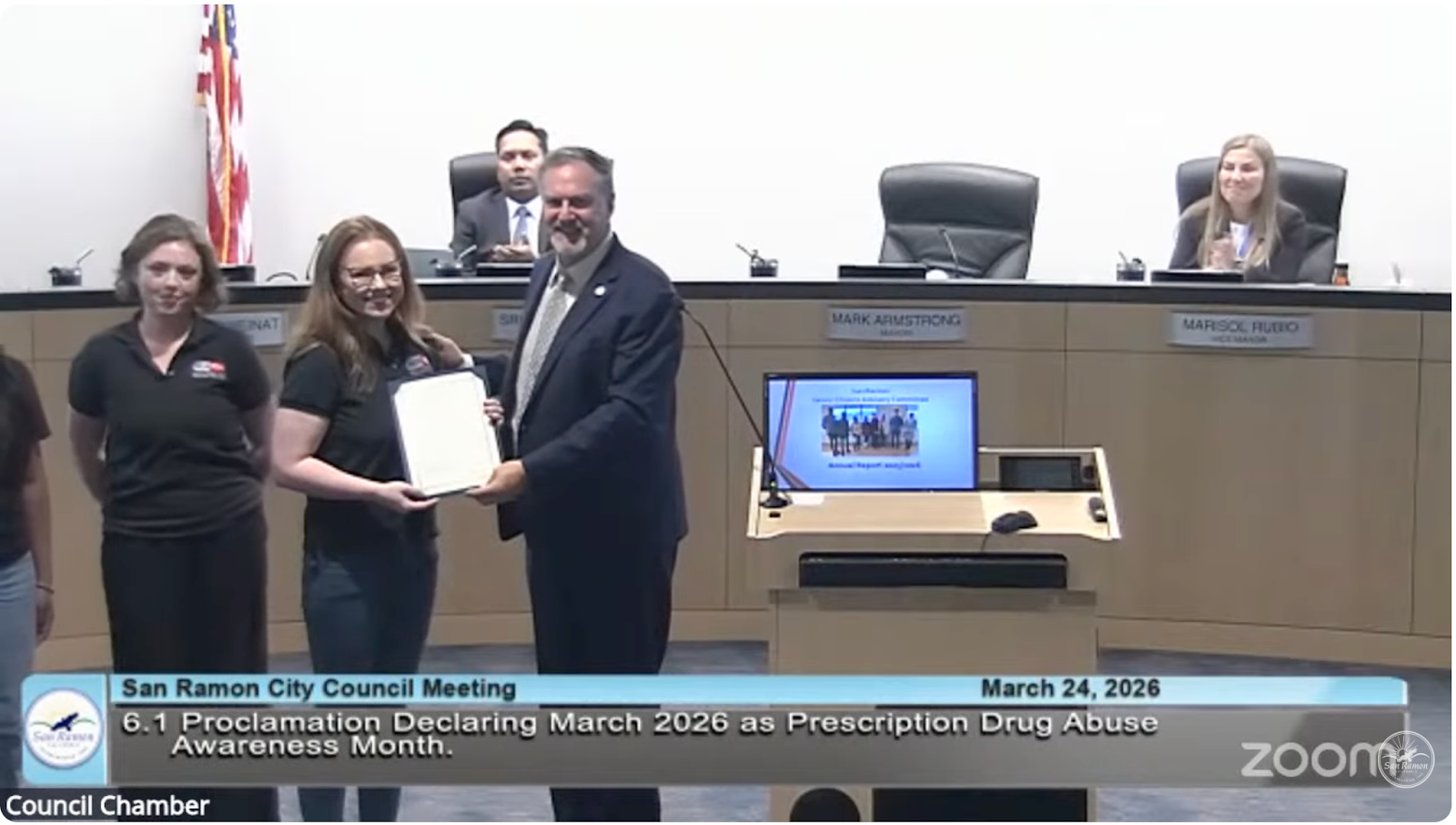Even though the main topics of discussion were the city’s finances, the Mayor declared March 2026 as Prescription Drug Abuse Awareness Month. Accepting the award on behalf of Founder/Executive Director of the National Coalition Against Prescription Drug Abuse, April Rovero, was Project Manager Alice Power.