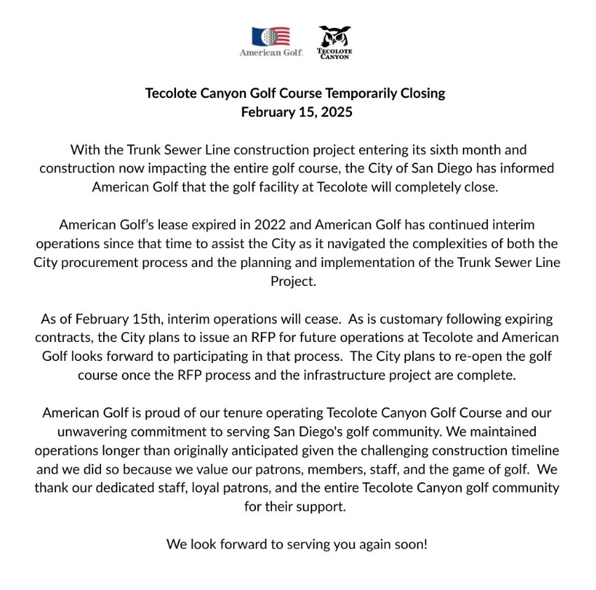(SAN DIEGO, CA.) - Tecolote Canyon Golf Course is currently closed while San Diego replaces a major sewer line running through the property. The city-owned course, long known for its affordable fees, is also transitioning to a new operator, raising questions about costs and access when it reopens.
