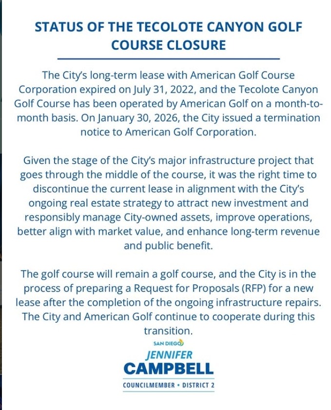 The changes at Tecolote are part of a citywide effort to better manage its golf courses. The City of San Diego owns 11 golf properties and leases eight to private and nonprofit operators. On Feb. 11, the City Council received a performance audit reviewing these leases and identifying ways to maximize revenue and improve oversight.