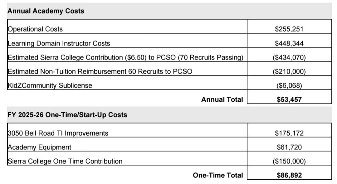 Budget in a memorandum from the PCSO to the Board. As found on meeting agenda documents. Photo Credit: from “Memorandum - Placer County Sheriff’s Office Establishment of a Regional POST-Certified Law Enforcement Training Academy” via Placer County Board of Supervisors / Image by Robert MacMahon