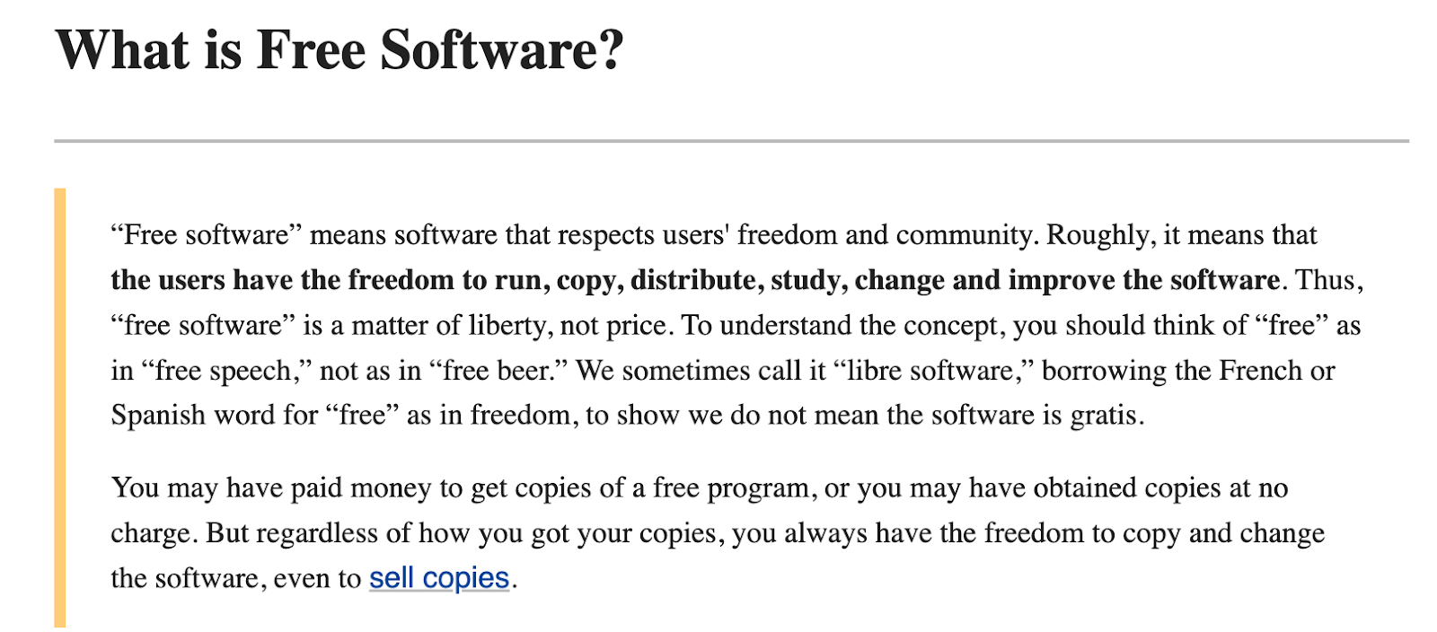 Lee outlined these freedoms during our interview: “Freedom to run the program as you wish, freedom to study the source code of this program and change it, freedom to redistribute exact copies and give them away or sell them when you wish, and freedom to redistribute with modified copies.”